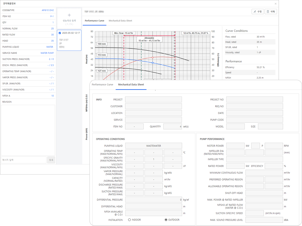 제품 선정 및 출력(PERFORMANCE CURVE), 데이터시트(DATA SHEET), 견적부터 판매까지